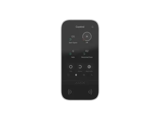 KeyPad TouchScreen využívá rozhraní známé z aplikací Ajax pro chytré telefony a poskytuje snadný a přehledný systém řízení zabezpečovacího systému. Dotykový displej s úhlopříčkou 5“ umožňuje rychlý přístup k aktuálnímu bezpečnostnímu režimu kterékoli skupiny nebo celého systému. Aktivuje se přiblížením dlaně a má automatickou regulaci jasu.
