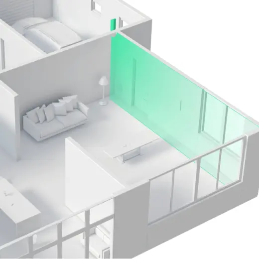 Bezdrátový PIR detektor pro vnitřní využití s charakteristikou záclona, dosah 12m, černá barva.