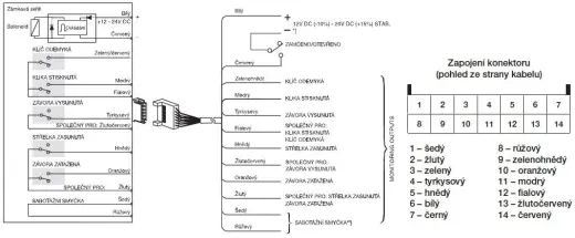 a) závora zatažená b) závora vysunutá c) klíč odemyká/volný d) klika stisknutá/volná e) dveře otevřené/zavřené |