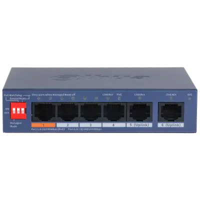 6-Portový cloud managed switch, 4x port 10/100 Mbps včetně PoE dle IEEE 802.3af/at (1x port Hi-PoE) celkový výkon 60 W, 2x port 10/100/1000 Mbps, extend mód pro spojení rychlostí 10 Mb/s do vzdálenosti 150-200 m na UTP včetně napájení PoE (dle kvality použitého vedení), automatická detekce 10/100 Mbps a zkřížení kabelů.