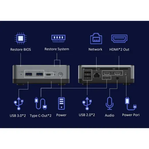 Porty: 2x HDMI výstup (pro 4K / víc obrazovek), 2x USB Type-C (podpora 4K), 2x USB 3.0, 2x USB 2.0, Audio combo port
