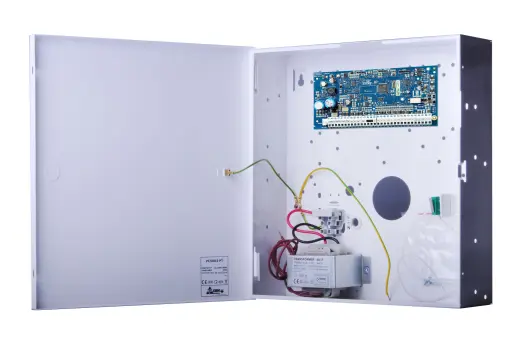 Souprava obsahující ústřednu POWER NEO HS2032, kovovou skříň, transformátor a tamper kontakt, místo pro AKU 7Ah, klávesnice HS2TCHP.