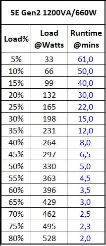 UPS Eaton 5E 1200 USB G2 s topologii line interactiv je určen pro vstupní napětí v rozsahu 140V – 300V. Maximální zatížení tohoto modelu je 1200VA/600W, doba zálohování napájení činí přibližně 40 minut při odběru 100W. UPS je osazena 6x výstupními zásuvkami C13, 2x 12V/7Ah kompaktní vyměnitelnou hermeticky uzavřenou baterií s ochranou proti hlubokému vybití a USB komunikačním portem. Zařízení umožňuje studený start - spuštění bez připojení k síti, LED a zvuková indikace stavu zařízení. Rozměry 330 x 180 x 133 mm, hmotnosti 8,3 kg.