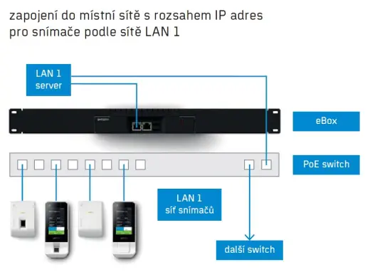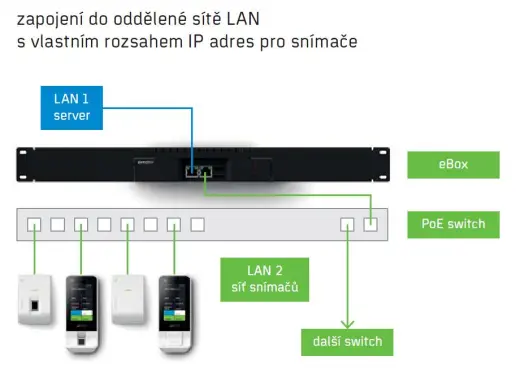 - 1 x LAN – oddělená síť snímačů, vlastní rozsah IP adres