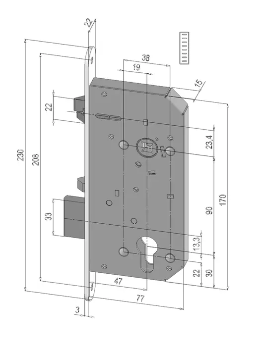 Rozměry standardního čela zámku: 230 x 22 x 3 mm, R11, nerez.