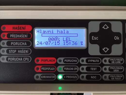 Pomocí relé signalizuje Alarm plyn 1. stupeň, Alarm plyn 2. stupeň, Alarm požár.