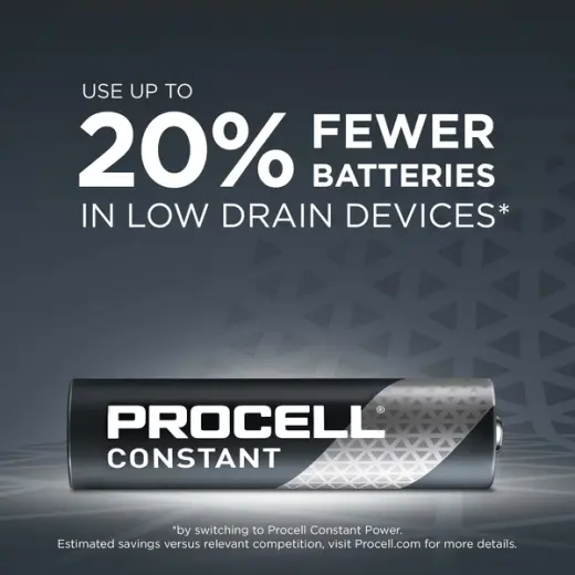 Průmyslové baterie Procell AlkalineConstant AAA jsou ideální pro napájení profesionálních zařízení s nízkou spotřebou, která vyžadují konstantní proud po dlouhou dobu, jako jsou bezdrátové detektory EZS, bezpečnostní klávesnice, dálkové ovladače a glukometry.