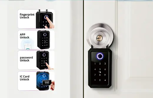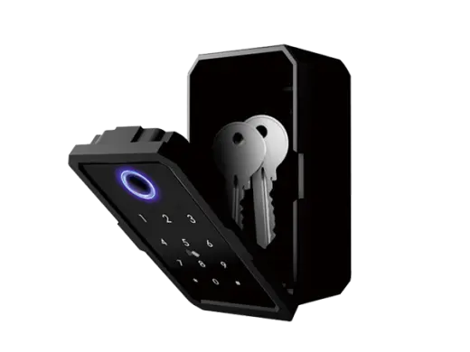 Voděodolná, anti-vandal, bateriová, schránka na klíče s kódovou klávesnicí, bezdotykovou čtečkou MF 13.56MHz a čtečkou otisku prstů.