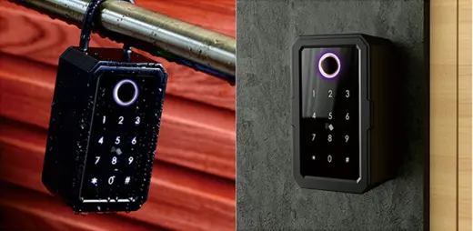 Voděodolná, anti-vandal, bateriová, schránka na klíče s kódovou klávesnicí, bezdotykovou čtečkou a čtečkou otisku prstů.