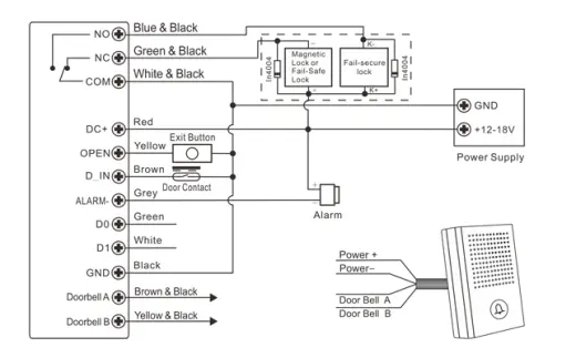 - 1x Ovládanie dverí (Relé [COM, NO, NC], max. 2A)