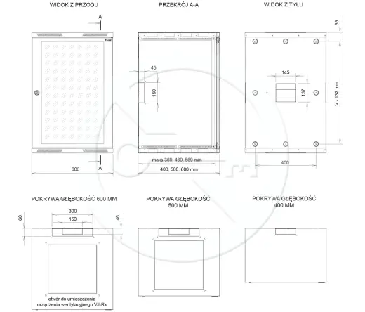 Vstup káblov je riešený vylamovacími otvormi umiestnenými v strope, dne, ďalej na bočných stranách rozvádzača a tiež v jeho chrbte.