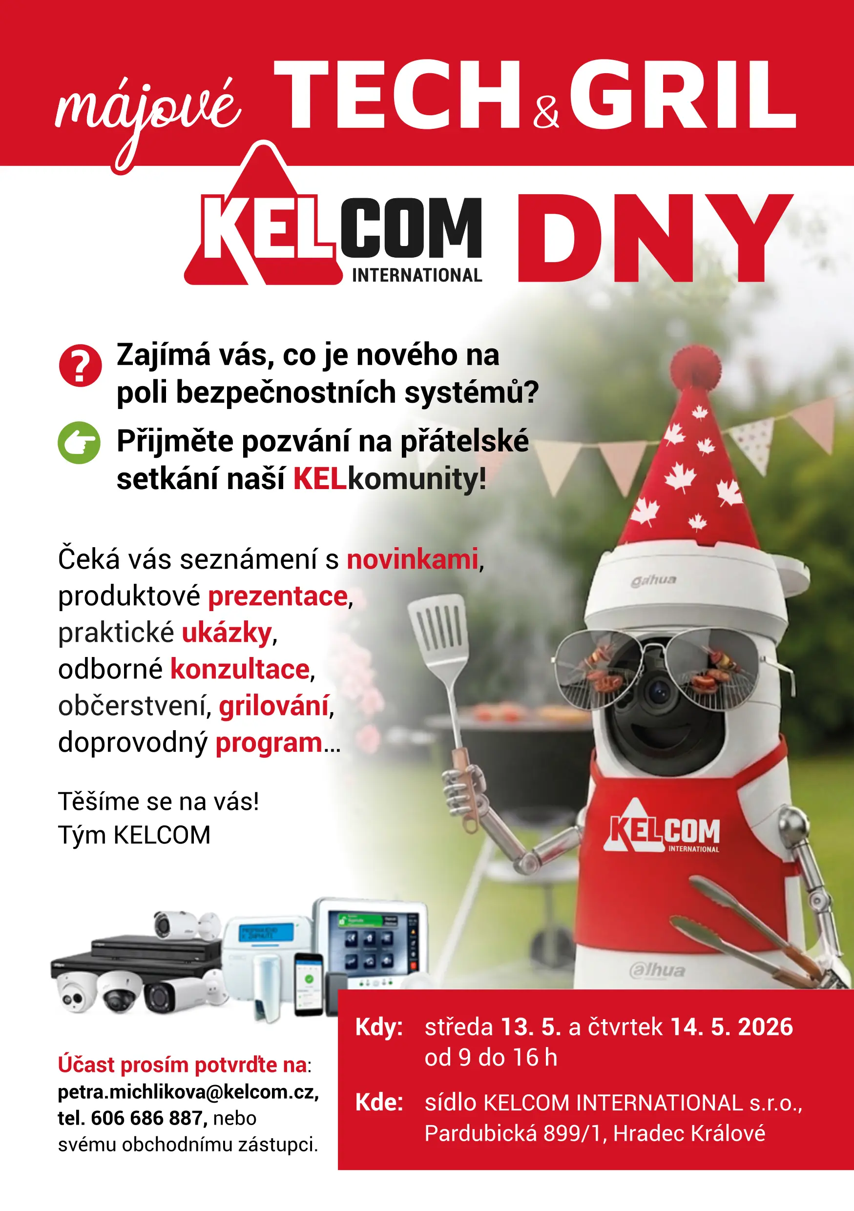 Společnost KELCOM International, spol. s r.o. Vás srdečně zve na tradiční zákaznickou akci Tech & Gril dny KELCOM, která proběhne ve dnech 13. a 14. května 2026 v našem sídle v Hradci Králové.
