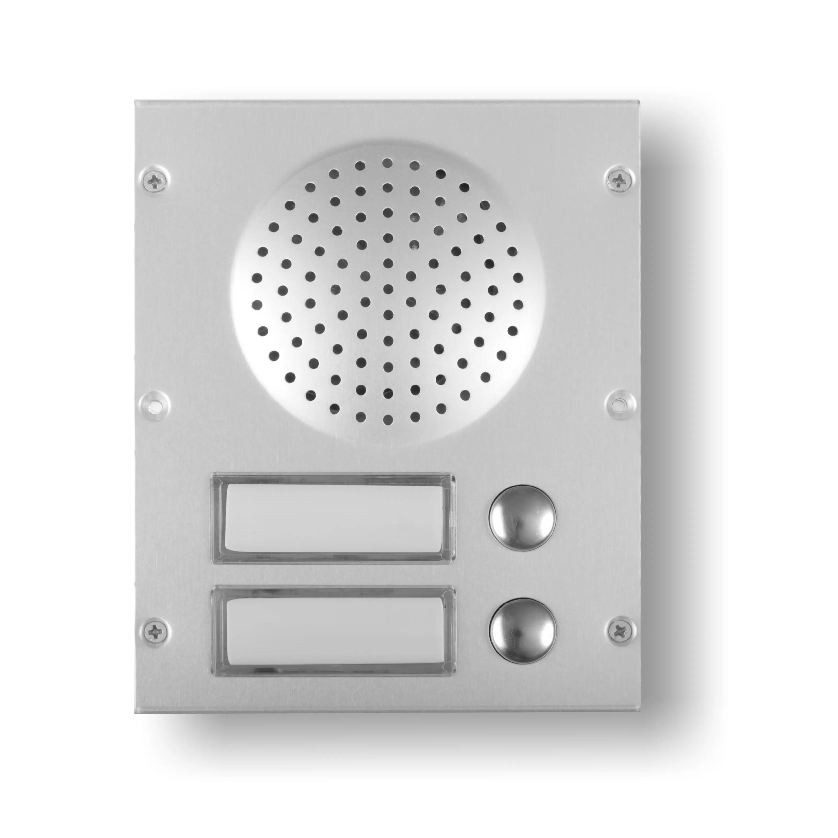 Dveřní nerezový 1+n audio modul série 8000 se dvěma tlačítky.